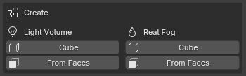 The top of the panel is the Create section. It always shows two columns: Light Volume and Real Fog, each with a Cube button and a From Faces button.