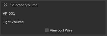 Once a valid Volume Forge object is selected, the panel shows a Selected Volume box with the object name, the current mode (Light Volume or Real Fog), and the Viewport Wire toggle. Use this section to confirm that you are editing the correct object.